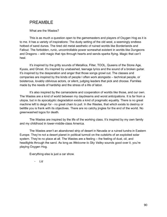OXYGEN HOG is a tabletop role-playing game about rough, desert-bound vehicular adventures. Jump in with your friends, select from one of four classes, and utilize detailed vehicle rules to explore a post-apocalyptic Wasteland.